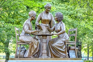 Three realist figures are the first historic women in Central Park statuary; other females are legends or literary characters. This isn’t the first time three women have been grouped in a statue to try to interrupt an entire collection of great men: see the Hall of Satuary in the U.S. Capitol.